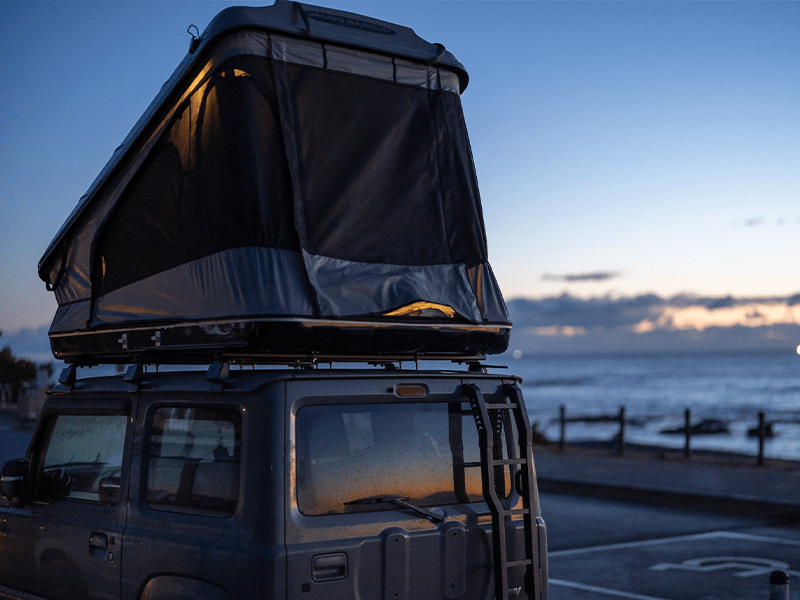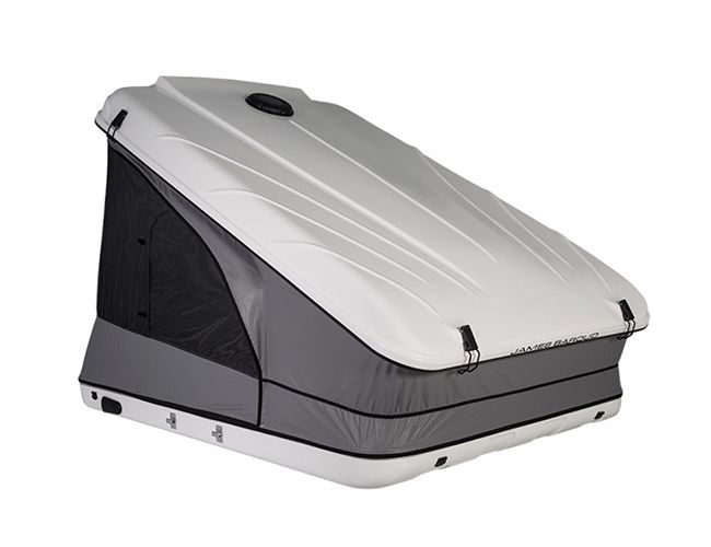 Tienda de techo James Baroud de apertura angular con cubierta rígida totalmente impermeable y resistente a vientos de más de 120 km/h que se adapta a cualquier vehículo con barras de techo reforzadas. A diferencia de las otras tiendas de apertura angular, ésta tiene 4 cierres de seguridad, porque se levanta por ambos lados. Es la más altura interior de la gama, 50 cm en un lado, y 145/155 cm en la apertura (según el tamaño), de modo que los adultos se sienten muy cómodos dentro. No requiere de ningún tipo de homologación y se puede almacenar cuando no se utiliza.