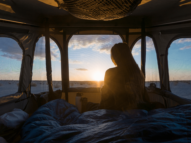 También encontramos en el interior un extractor silencioso alimentado por una placa solar integrada en la cubierta. Este se activa manualmente y contribuye a evacuar la humedad acumulada y evitar la condensación que se produce en el interior de la tienda cuando dormimos. Entre otros detalles de confort encontramos los bolsillos de almacenaje, la red portaobjetos del techo y el colchón fabricado con espuma de alta densidad. Además de tener un grueso suficiente para ofrecer el máximo confort, viene cubierto con una funda que facilita su limpieza. Todos estos elementos quedan incorporados en la tienda cuando la cerramos. Incluso hay espacio para dejar todo lo necesario para dormir como la almohada, el edredón, el saco de dormir…